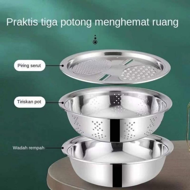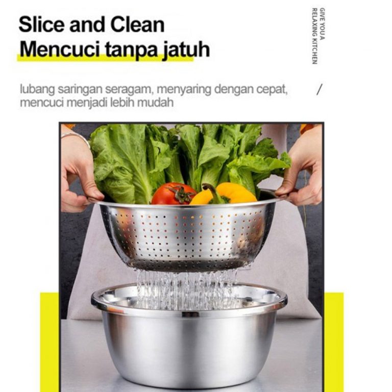 Baskom ini memiliki lubang-lubang ventilasi air sehingga air dapat mengalir kebawah baskom. Dapat digunakan untuk menyaring sayur ataupun buah-buahan. Baskom ini juga dilengkapi dengan pemarut sehingga Anda bisa sekaligus memarut sayur dan buah.Note: Fisik asli seperti gambar 2 – 5.Fitur Keranjang Tiris Baskom ini memiliki lubang-lubang ventilasi air sehingga air dapat mengalir kebawah baskom. Dapat digunakan untuk menyaring sayur ataupun buah-buahan. Fungsi Parutan Baskom ini juga memiliki tutup yang berupa parutan sehingga Anda juga bisa memarut buah dan sayur menggunakan alat ini. Durable Material Rak ini terbuat dari bahan stainless steel sehingga tidak gampang rusak dan berkarat.