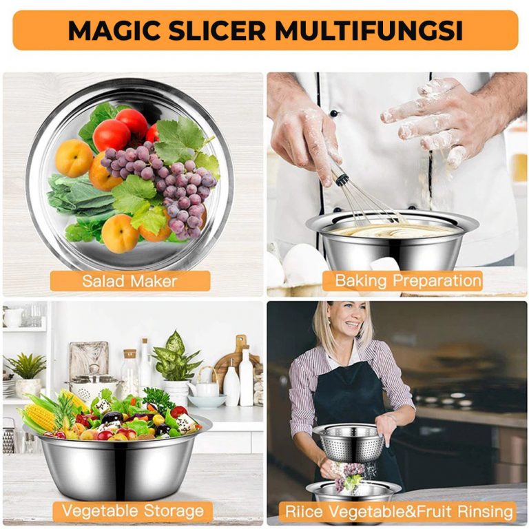 Baskom multifungsi ini terbuat dari tiga bagian , merupakan alat yang berfungsi untuk memotong aneka macam sayuran dan buah dengan lebih cepat dan praktis, alat ini sangat cocok untuk Anda yang memasak di dapur, dan pengusaha restaurant,memotong sayuran dan buah buahan menjadi sangat cepat dengan hasil potongan yang merata, dan dapat menghemat waktu anda.