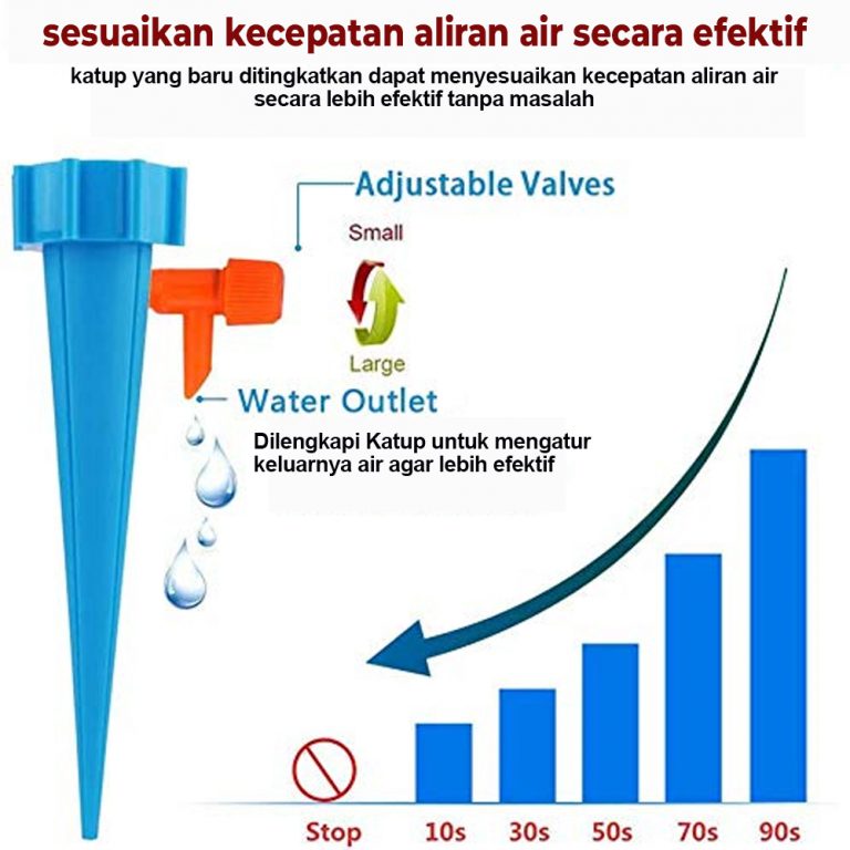 - Laju aliran dapat dikontrol. Perangkat penyiraman tanaman dengan katup kontrol dapat mengontrol kecepatan tetesan 0-60 detik / 1 tetes, dan tetesan pelepasan berkelanjutan berlangsung selama 1-15 hari.