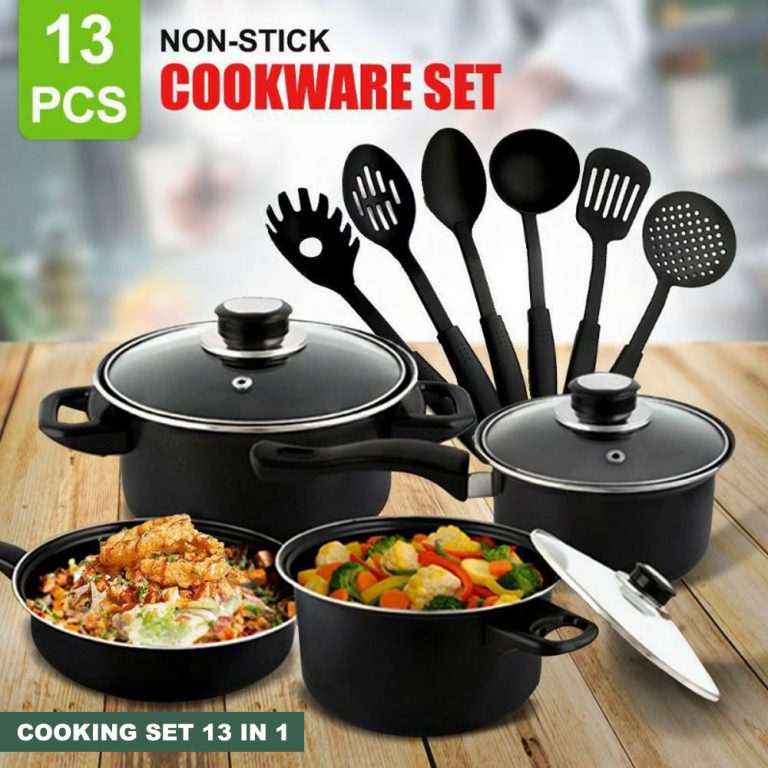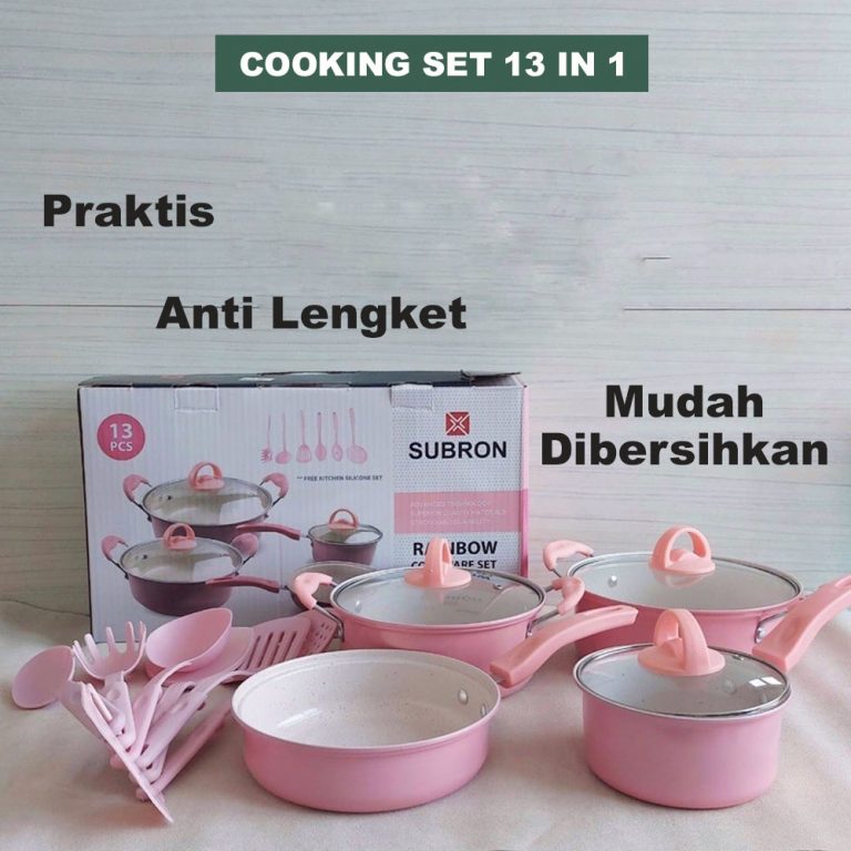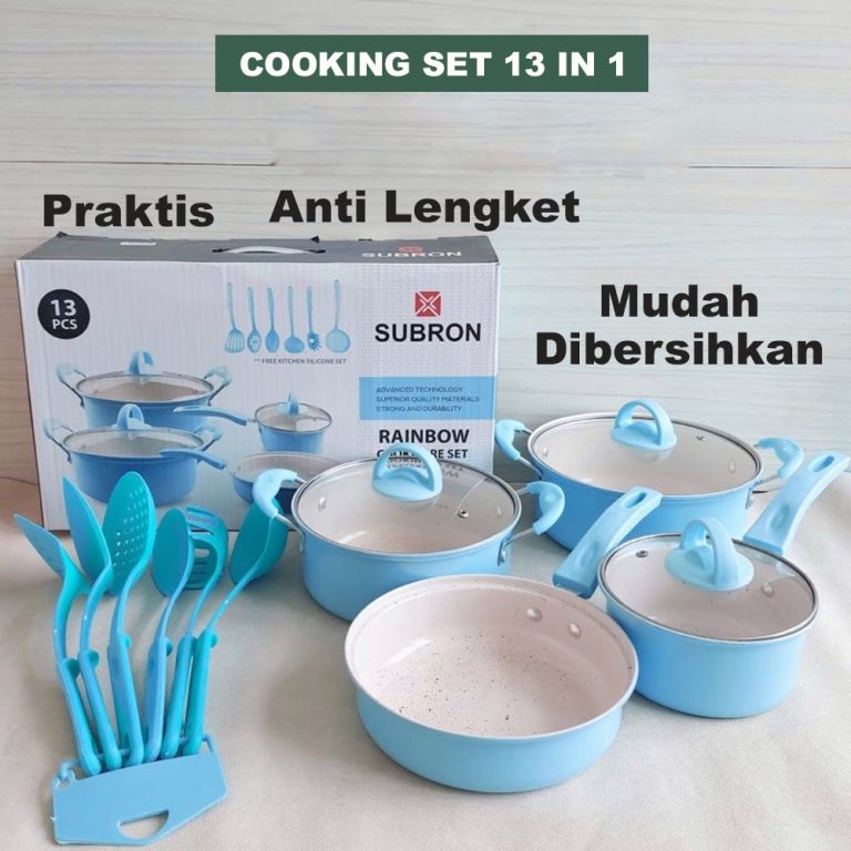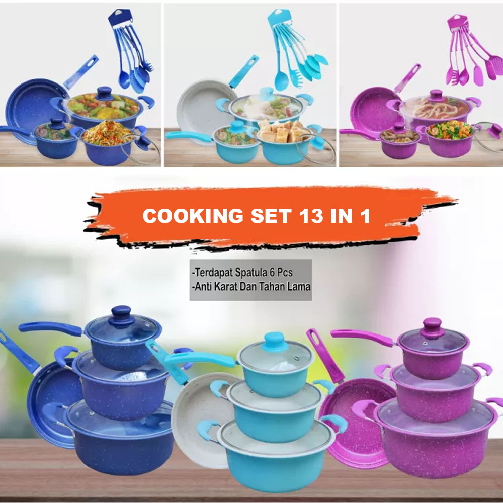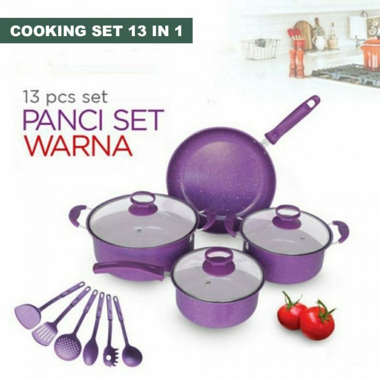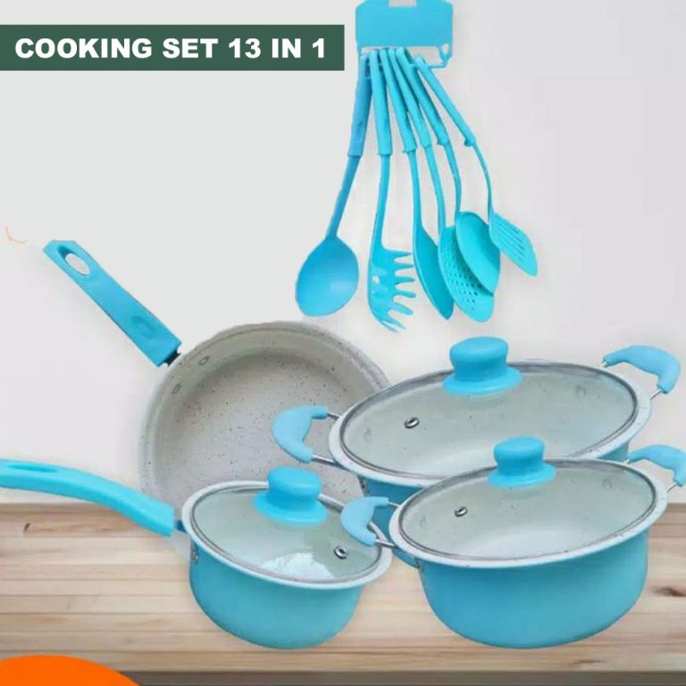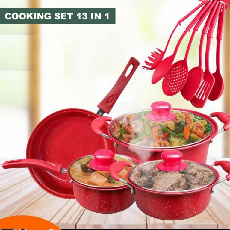 Cooking set Anti Lengket 13 In 1 Adalah alat masak set ANTI LENGKET dengan bahan Stainless dengan coating Anti Lengket. Dengan alat masak set ini bunda tidak perlu lagi beli banyak alat memasak yang menguras kantong. Semuanya tersedia dalam produk yang kami suguhkan, bunda bisa menggoreng, memanggang, menumis, membuat sayur, dan yang lainnya.