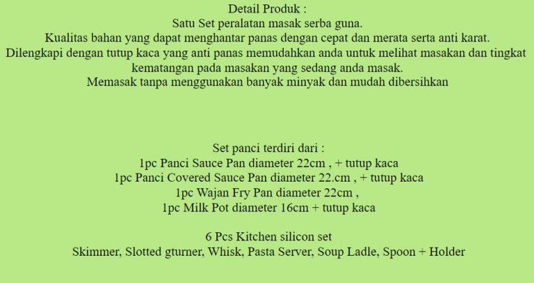 Kualitas bahan yang dapat menghantar panas dengan cepat dan merata serta anti karat. Dilengkapi dengan tutup kaca yang anti panas memudahkan anda untuk melihat masakan dan tingkat kematangan pada masakan yang sedang anda masak. Cukup dengan satu set alat kami semua beres, gak lengket, gak ribet, dan hemat biaya