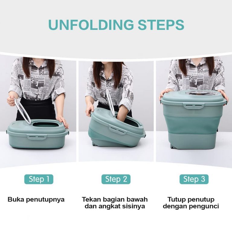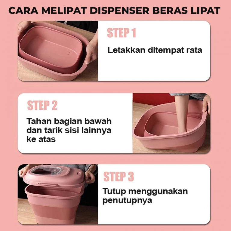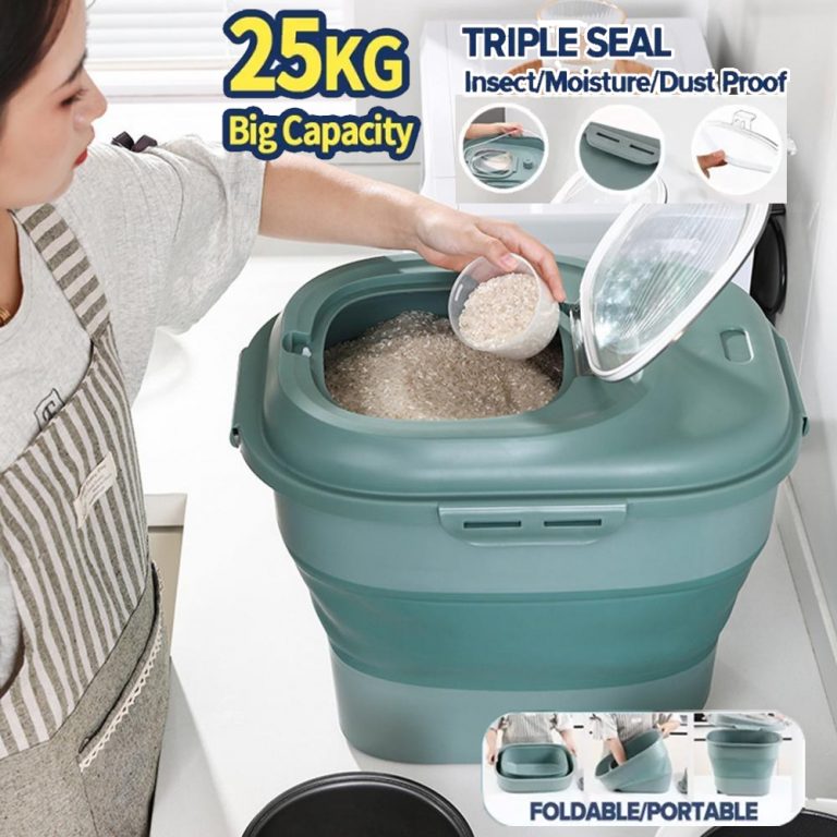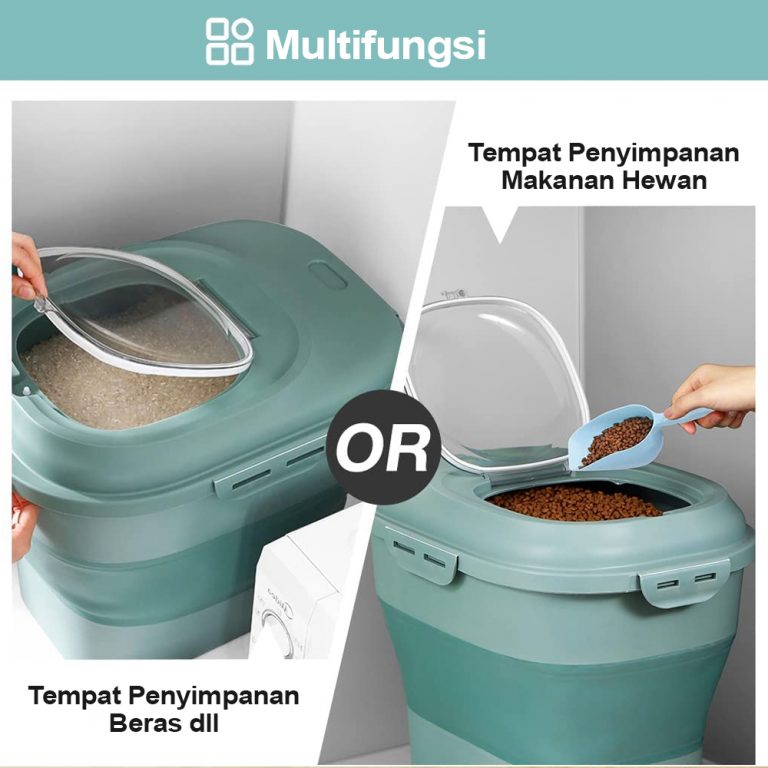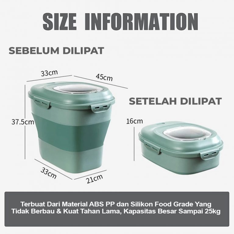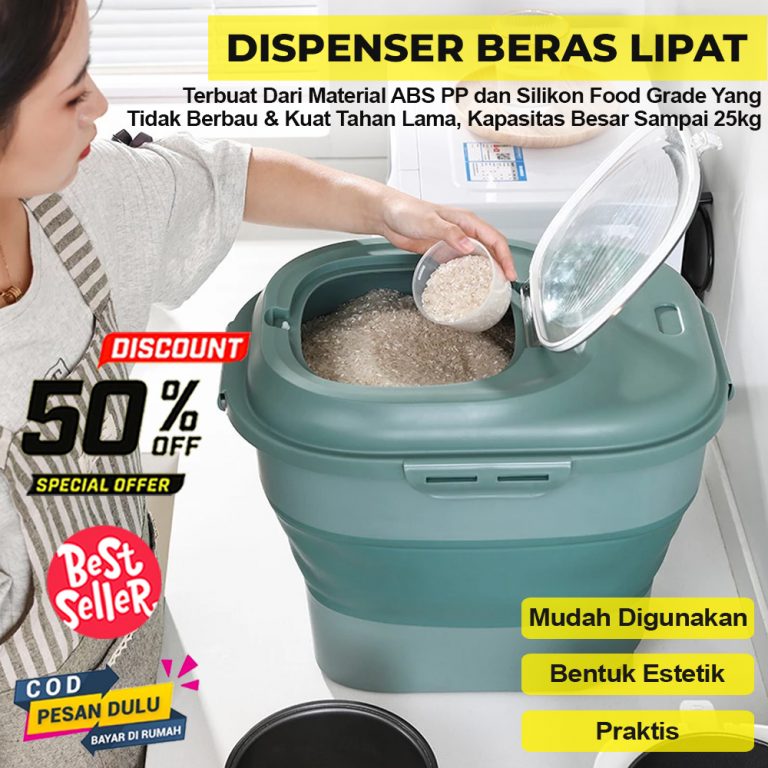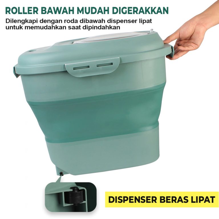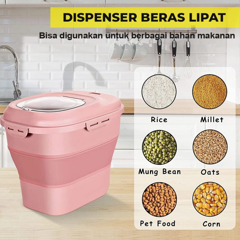 Dispenser beras lipat anti hama dan lembab dilengkapi cangkir untuk mengukur dengan saringan. Tempat beras dengan menggunakan material yang aman untuk beras sehingga beras yang disimpan awet dan tidak berkutu, tidak merusak kualitas beras yang disimpan. Dengan bukaan lebar diatasnya sehingga memudahkan saat memasukan beras plus pencuci beras yang praktis.