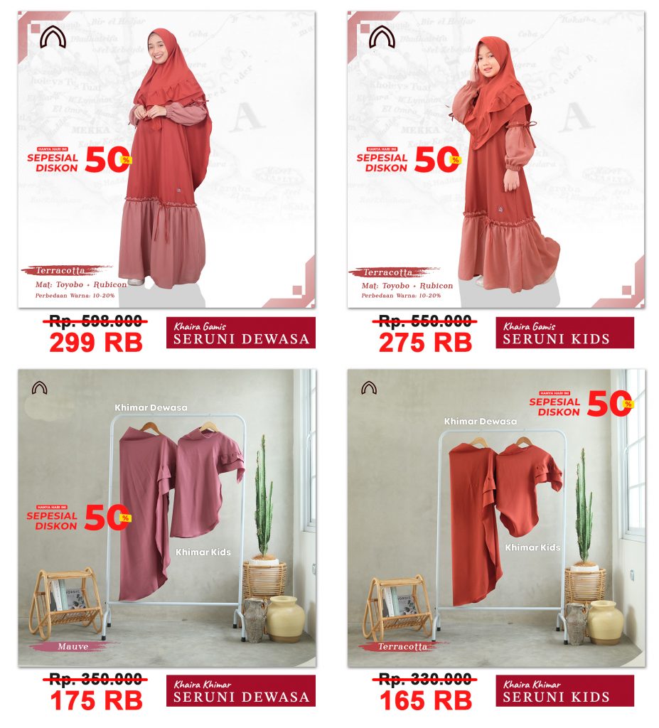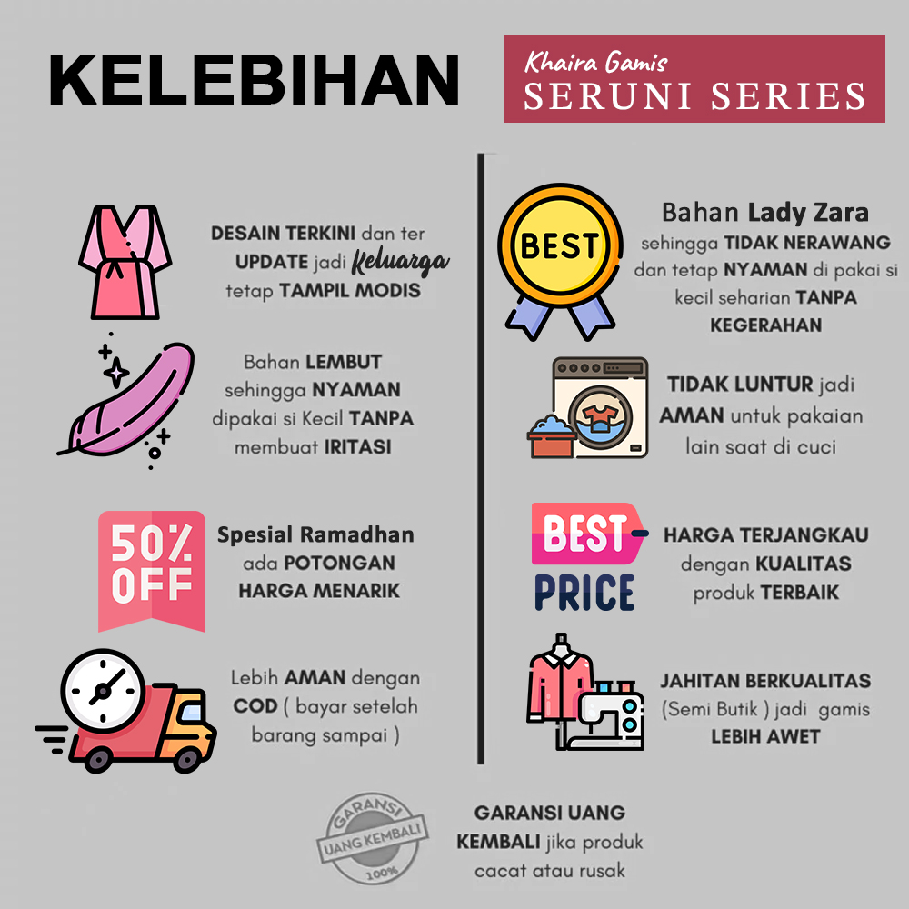 “Dulu aku kadang suka bingung nyari baju yang cocok buat acara kumpul keluarga, biasanya memakai baju seadanya dengan model berbeda, yang membuat kesan tidak kompank dan kurang rapi. Mau beli baju samaan tapi harganya mahal-mahal, kadang bingung sendiri. Pas saya liat ada iklan yang menawarkan produk gamis seruni ini, membuat saya tertarik, terlebih harganya yang sangat murah hehe… yang membuat pengeluaran menjadi lebih hemat dan kualitas serta modelnya juga sangat bagus. jadi recomended deh”