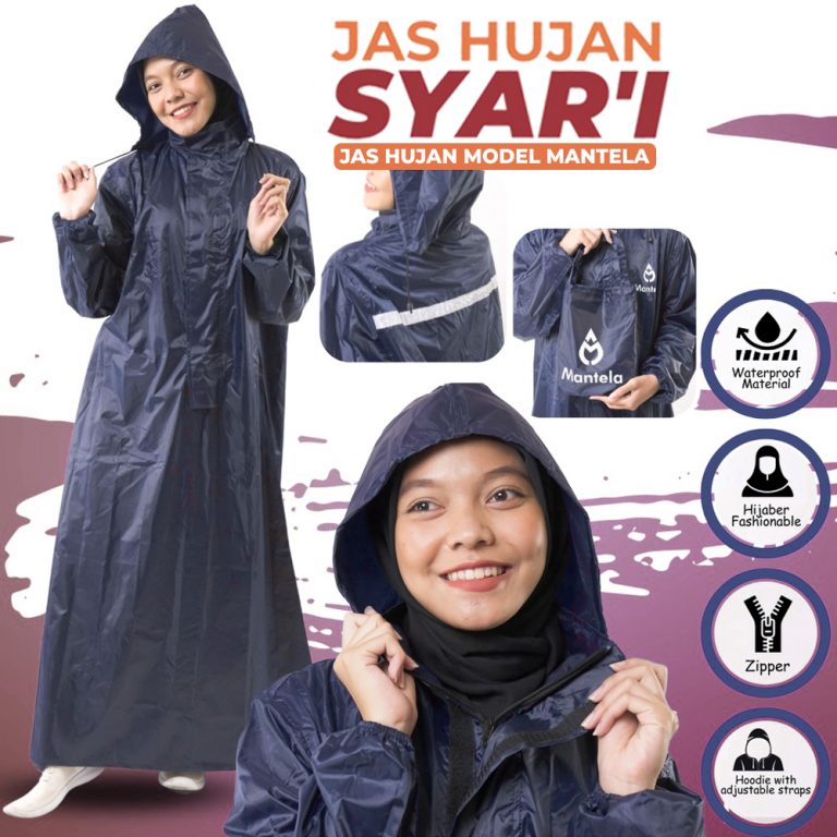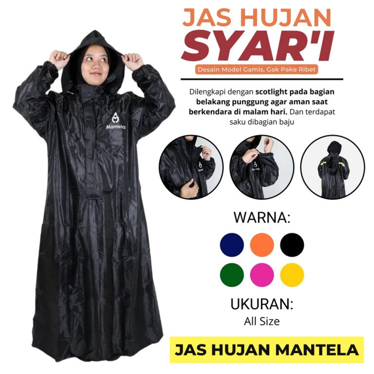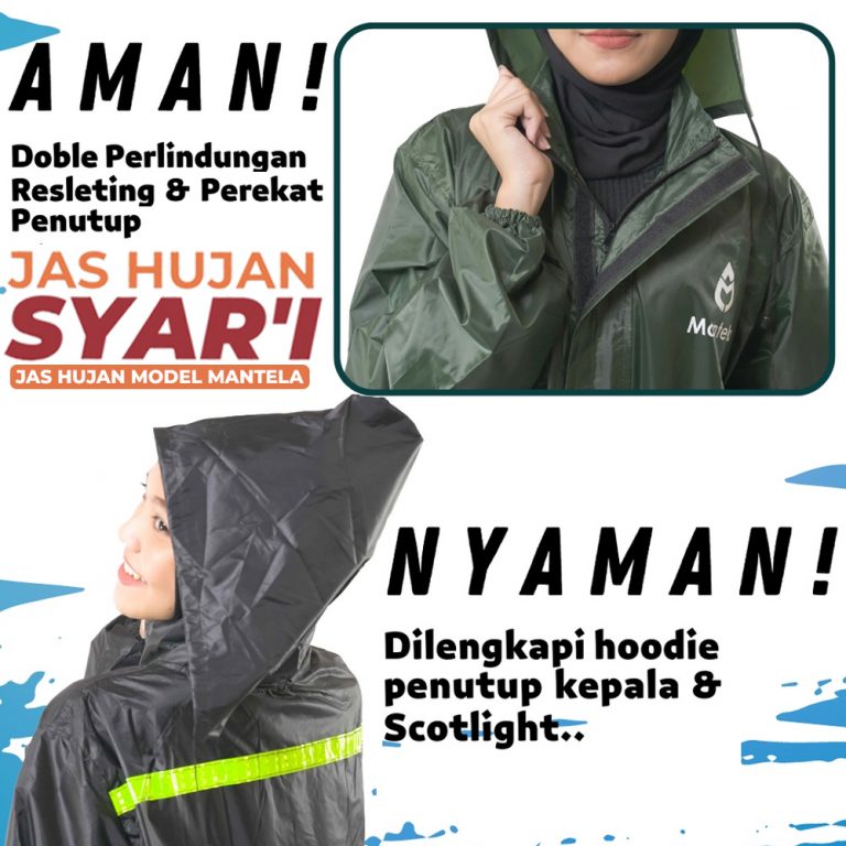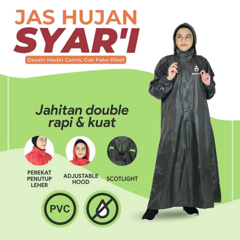 Jas hujan ini terbuat dari bahan material yang sangat bagus yaitu PVC 2.5 sehingga anti air (100% waterproof), tidak panas, tidak kaku dan tidak mudah sobek karena gesekan. Selain melindungi tubuh, tersedia juga tali pengikat pada bagian kepala untuk memberikan Anda perlindungan yang lebih maksimal.  Kini hadir dengan design terbaru sehingga dapat digunakan untuk pria maupun wanita yang syar’i.
