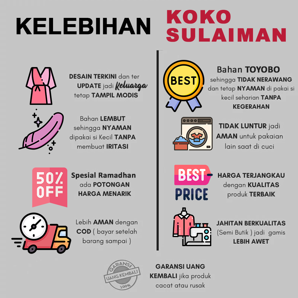 “Dulu aku kadang suka bingung nyari baju yang cocok buat acara kumpul keluarga, biasanya memakai baju seadanya dengan model berbeda, yang membuat kesan tidak kompak dan kurang rapi. Mau beli baju samaan tapi harganya mahal-mahal, kadang bingung sendiri. Pas saya liat ada iklan yang menawarkan produk koko sulaiman ini, membuat saya tertarik, terlebih harganya yang sangat murah hehe… yang membuat pengeluaran menjadi lebih hemat dan kualitas serta modelnya juga sangat bagus. jadi recomended deh”