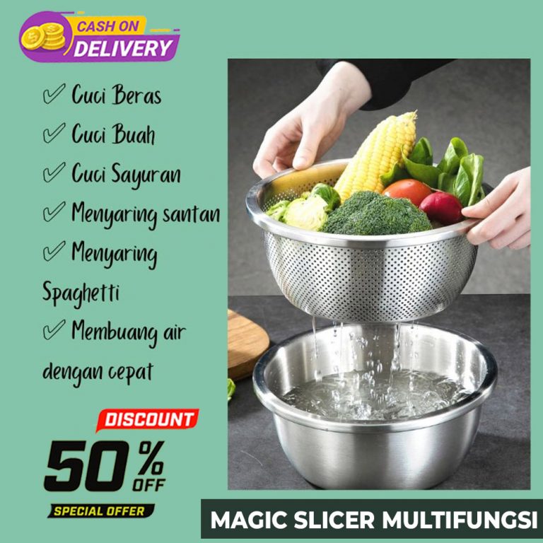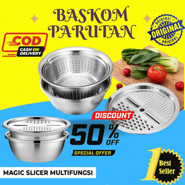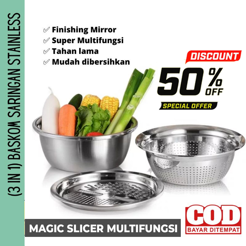 Baskom multifungsi ini terbuat dari tiga bagian , merupakan alat yang berfungsi untuk memotong aneka macam sayuran dan buah dengan lebih cepat dan praktis, alat ini sangat cocok untuk Anda yang memasak di dapur, dan pengusaha restaurant,memotong sayuran dan buah buahan menjadi sangat cepat dengan hasil potongan yang merata, dan dapat menghemat waktu anda.