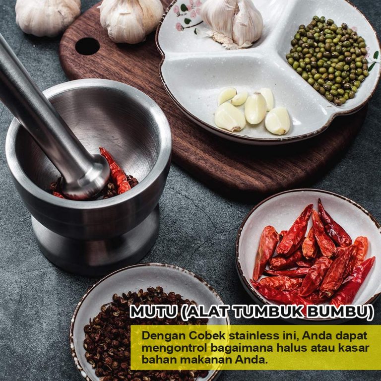 Sudah sejak dulu digunakan dan mudah, tapi suka nyiprat-nyiprat alhasil jadi kotor semua apalagi kalo sambal jadi pedes semua. Dengan memakai jangka waktu yang lama, cobek akan terkikis dan sambal auto ada kerikilan halus bebatuannya. Dengan Alat ini Anda dapat mengontrol bagaimana halus atau kasar bahan makanan Anda.
