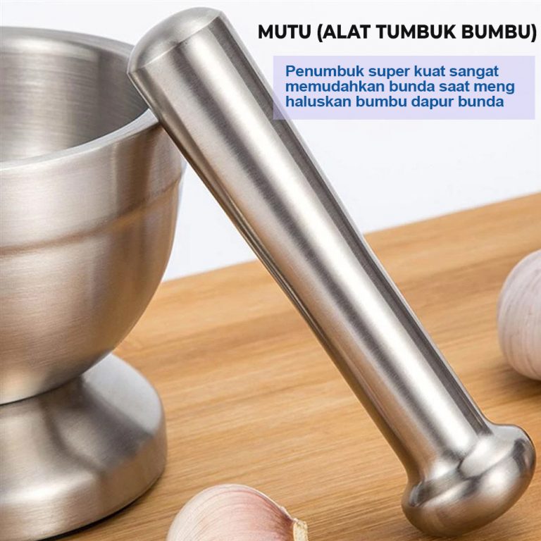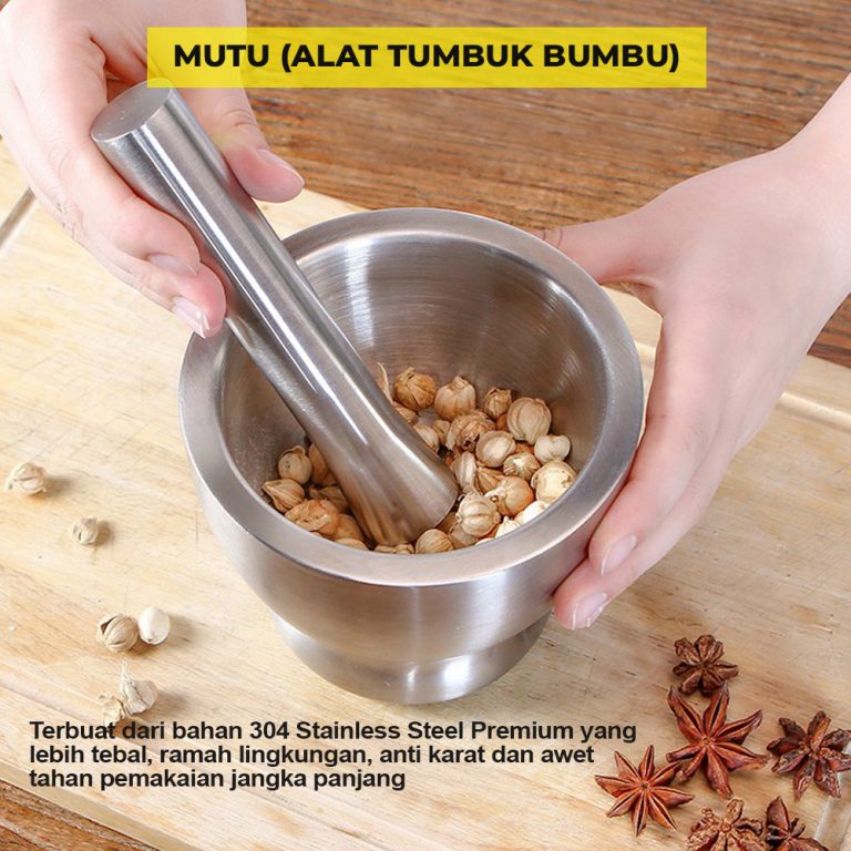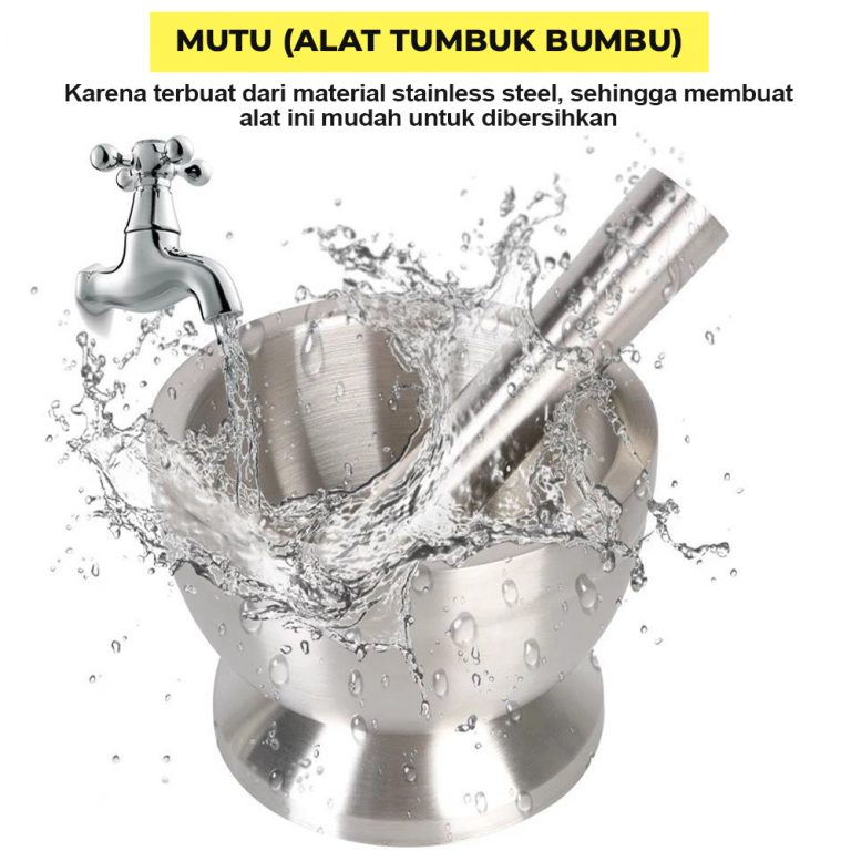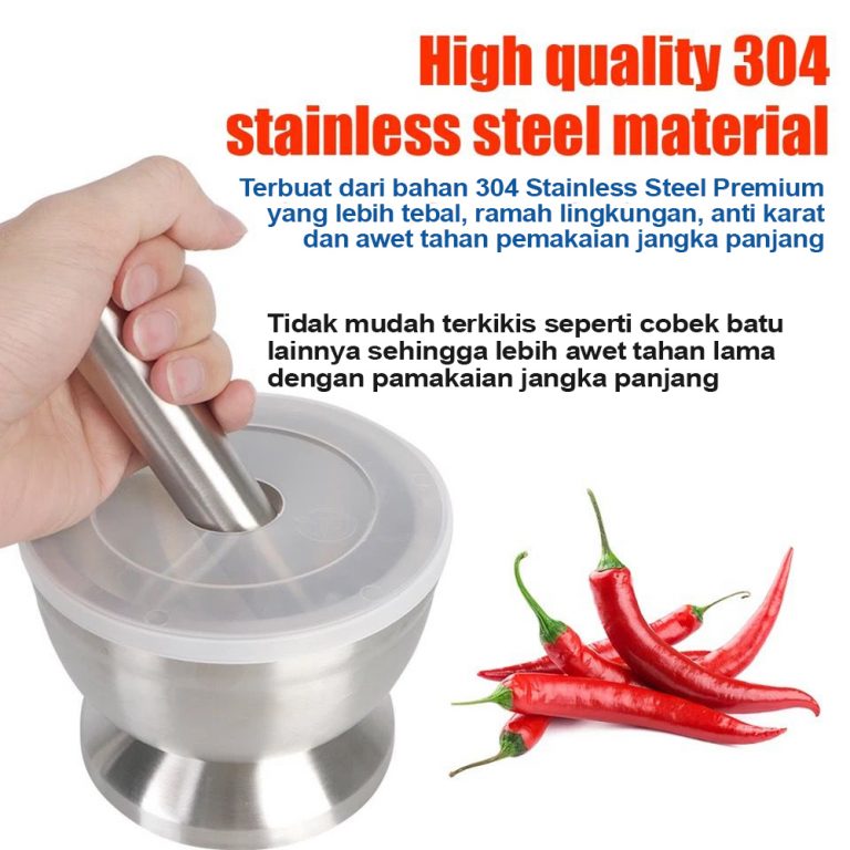 Cobek dengan desain mutakhir yang anti nyiprat dan dapat menghaluskan bumbu atau sambal dengan mudah dan cepat. Sangat aman dan cocok untuk makanan atau pun obat apa pun. Stainless steelnya juga super kuat dan super awet untuk menumbuk apa pun yang ingin ditumbuk. Super higienis! Dengan food-grade stainless steelnya, sangat mudah dibersihkan dan tidak ada sela-sela atau pori-pori kecil dimana sisa makanan atau obat tidak dapat dibersihkan.