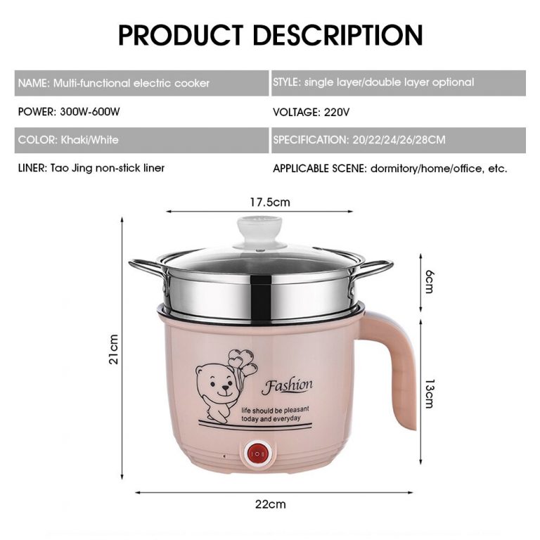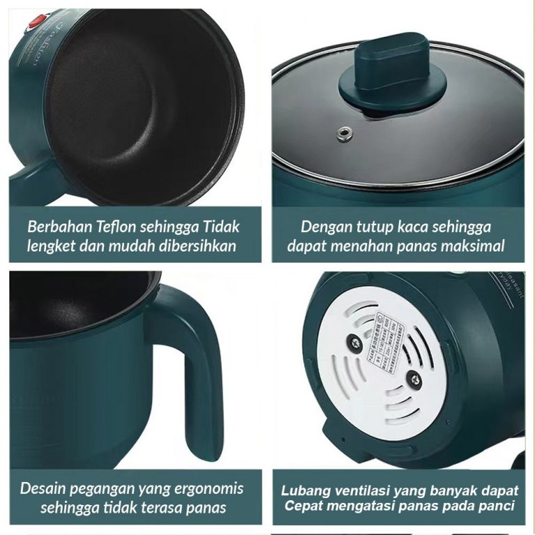 Material : Ceramic, Stainless dan Tutup dari Kaca.Low Watt Suhu Antara 400-800watt dan Tegangan 220VDiameter Panci 22cmKapasitas 2,2 LiterMultifungsi Bisa Untuk Mengukus, Merebus, Menggoreng dan MenumisAnti Lengket & Mudah DibersihkanLebih Cepat Matang, Hemat Gas dan Hemat WaktuLebih Praktis, Mudah Bisa Memasak dan Mengukus SekaligusTerdapat 3 Tingkat Suhu Yang Bisa Diatur Yaitu Low, Medium dan HighTerdapat Kontrol Suhu Ganda, Jika Kekurangan Air/Suhu Terlalu Tinggi Akan Mati OtomatisPaket Sudah Termasuk Electric Pan, Kukusan, Tutup dan Bonus Centong