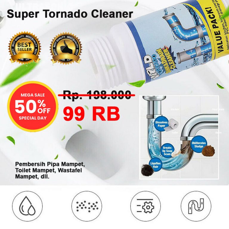 “Gak perlu lagi khawatir Wc, wastafel dan saluran pipa pembuangan mampet, tinggal pakai Tornado Super Cleaner semua beres! Cukup Tuangkan produk kedalam saluran yang mampet, semuanya kembali lancar dan bersih”
