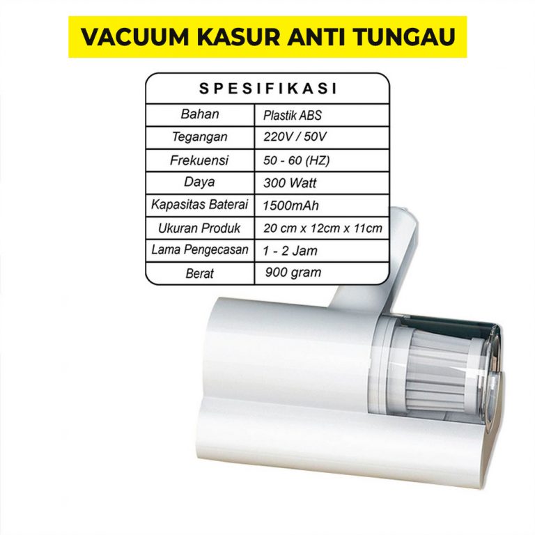 Alat Penghisap debu ini adalah solusi buat kamu yang mau menyedot debu atau kotoran halus pada kasur, kursi, sofa dan media kain lainnya. Produk ini dilengkapi dengan roda dibagian bawah yang bisa membuat proses membersihkan jadi lebih mudah, setelah membersihkan semua debu atau kotoran akan tertampung didalam wadah transaparan yang dilengkapi dengan Hepa Filter.